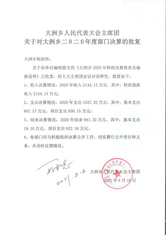 大洲乡人民代表大会主席团关于对2020年部门决算的批复