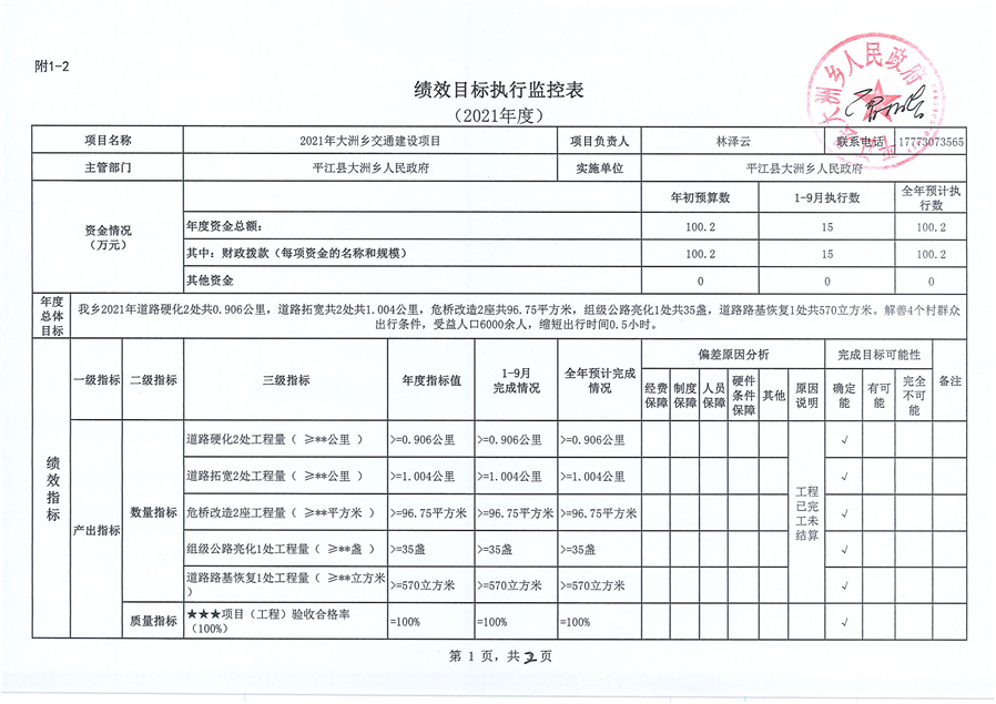 大洲乡2021年统筹整合涉农资金项目库绩效监控(交通)