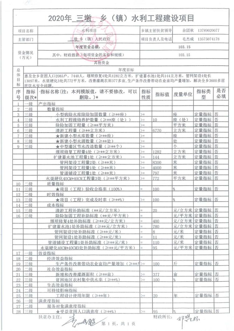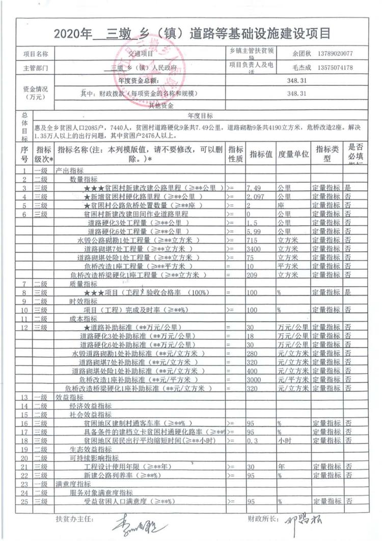三墩乡2020年统筹整合涉农资金项目库预算绩效申报