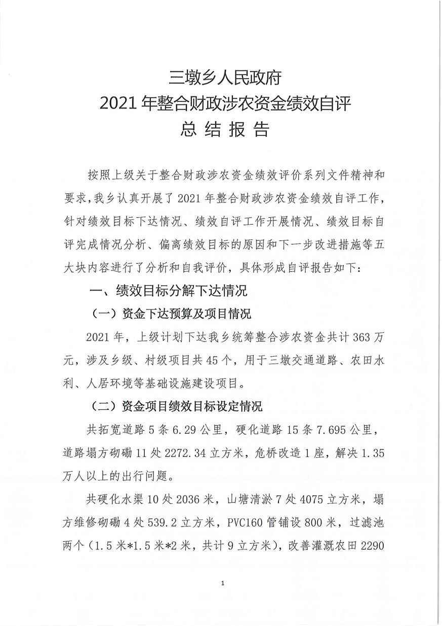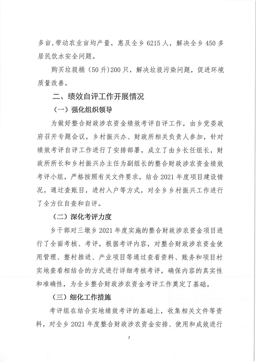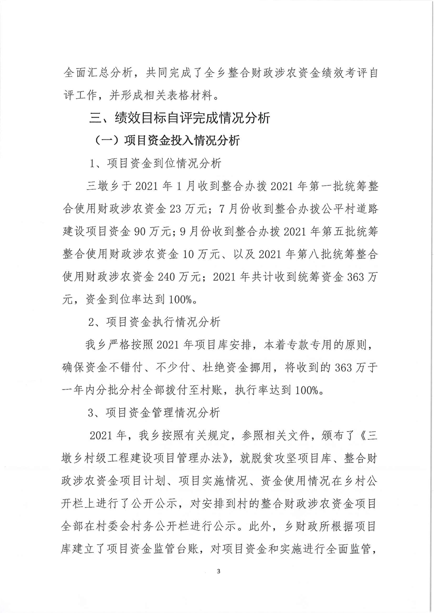 三墩乡人民政府2021年统筹整合使用财政涉农资金绩效自评总结报告
