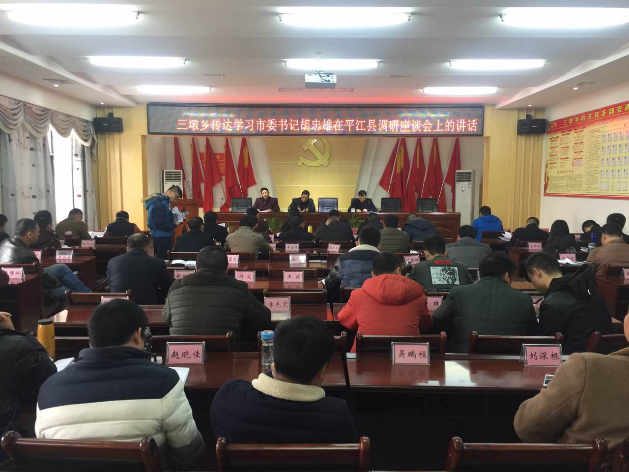 1月9日,三墩乡召开会议,传达学习市委书记胡忠雄在平江县调研座谈会上的讲话,全体干部职工和村支部书记参加学习。会议传达学习了岳阳市委书记胡忠雄12月18日在平江调研的讲话精神。胡书记充分肯定了我县过去的工作成绩,并就精准扶贫、工业园建设、生态旅游和党的建设进行了深入剖析。他强调,抓好精准扶贫,要在扶谁、谁扶、怎么扶、扶得怎么样四个环节上下功夫,切实抓好精准识贫、帮扶队伍、金融扶贫、产业扶贫等工作,务实为民,在全面建成小康社会进程中不让一个困难群众掉队。要吹响工业化的集结号,重点解决园区体制、园区项目、园区建设、园区招商等问题。要全力推动全域旅游的发展,做好全区域规划,切实解放思想、开放资源,引进大手笔战略投资商等。要切实抓好党建工作,抓实队伍建设、组织建设、党风廉政建设等方面工作。