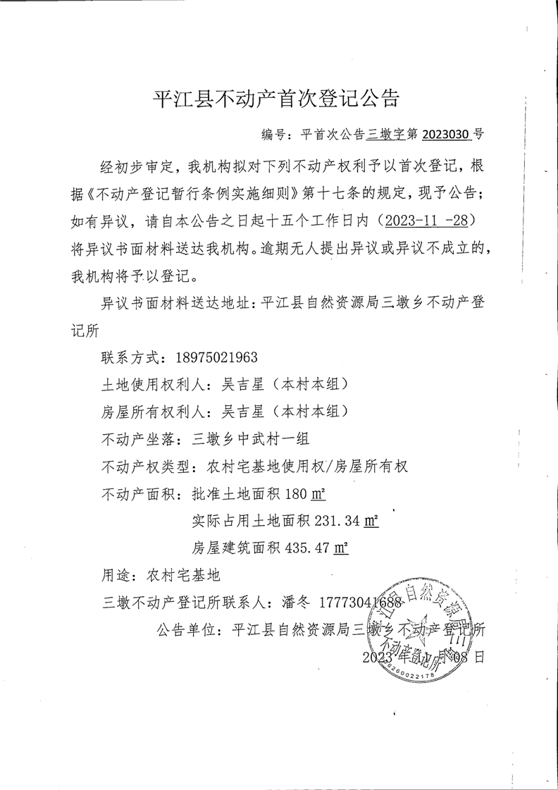 平江县不动产首次登记公告 吴吉星