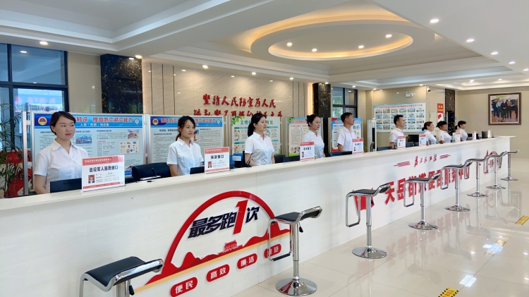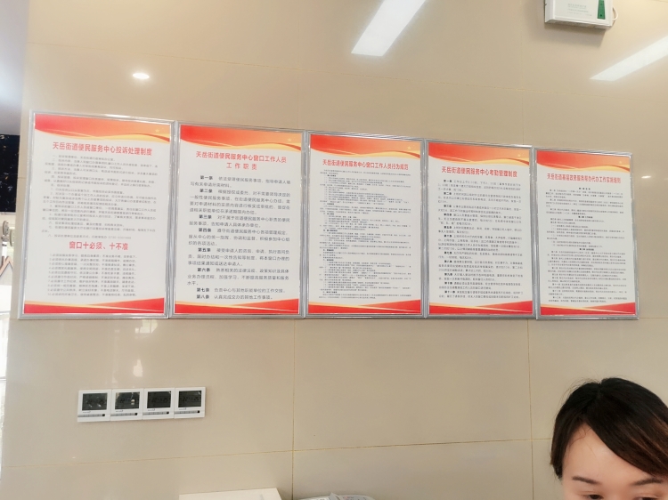 标准化配置服务设施。千方百计克服无固定办公场所的困难,积极与租借办公单位对接协调,对一楼大厅进行标准化改造。统一定制窗口柜台,对办公用品以固定位置规范摆放,确保干净、整洁;突出党建引领,在大厅设立“党建文化墙”,营造党建文化氛围;结合政务服务及文明创建相关要求,统一定制宣传标语、门头字、一米线等各类标志标识,让大厅整体环境焕然一新。