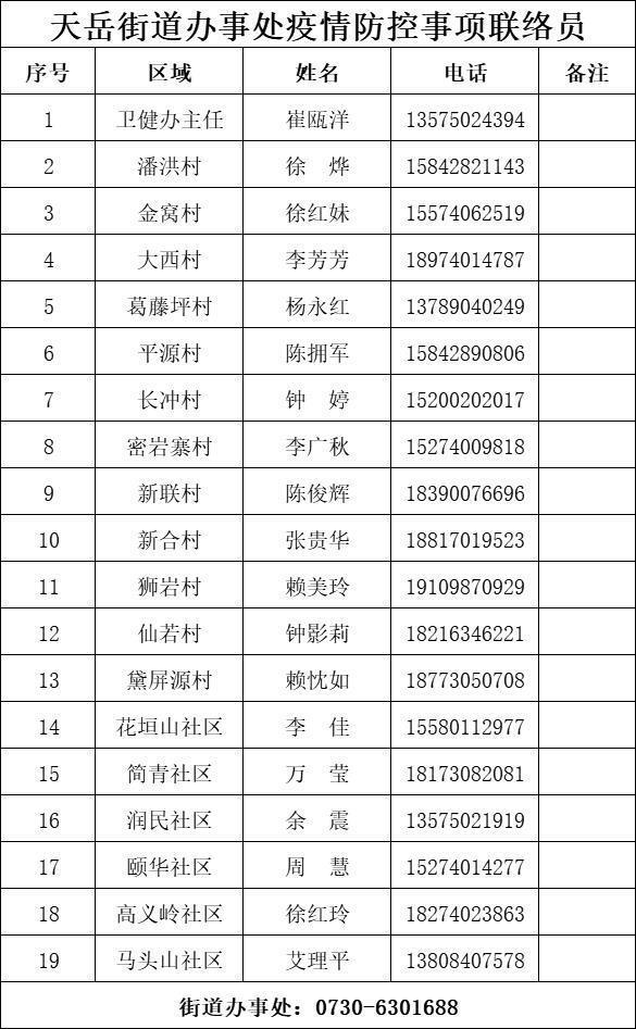 天岳街道有需要返平、来平人员,请按要求做好健康管理、核酸检测等工作,并向居住地村(社区)或属地报备,街道各村(社区)防疫咨询电话如下: