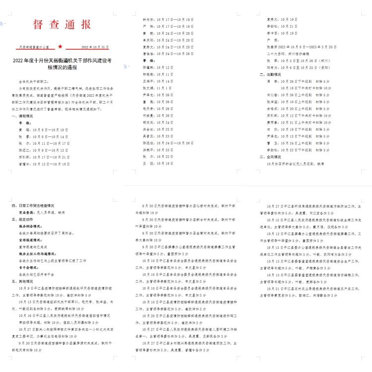成立机关督查室,细化考勤打卡、动态汇报、请假销假、线办例会、卫生管理、紧急任务响应等相关制度,明确管理目标和操作流程,由督查室选派人员每周最少三次进行不定期突击检查,每次督查即时通报干部在岗和公出情况,每月发布督查通报,对干部上班签到、去向动态、会议纪律、违纪行为、奖惩缘由等情况进行公布并在千分制考核中予以实时兑现,真正做到将作风优良的干部树立标杆,让勤勉不足的干部“红脸出汗”,达到强化行为规范、提振工作精神的良好效果。