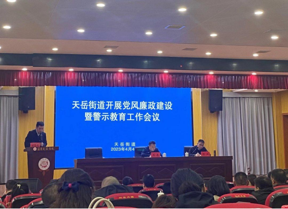为深入贯彻党的二十大精神,进一步加强党风廉政建设,筑牢干部思想防线,4月4日,天岳街道组织开展党风廉政建设暨警示教育工作会议,传达学习省、市、县相关文件精神,全面推动街道从严治党走深走实。天岳街道全体机关干部各村(社区)支部书记和各部门负责人与会。