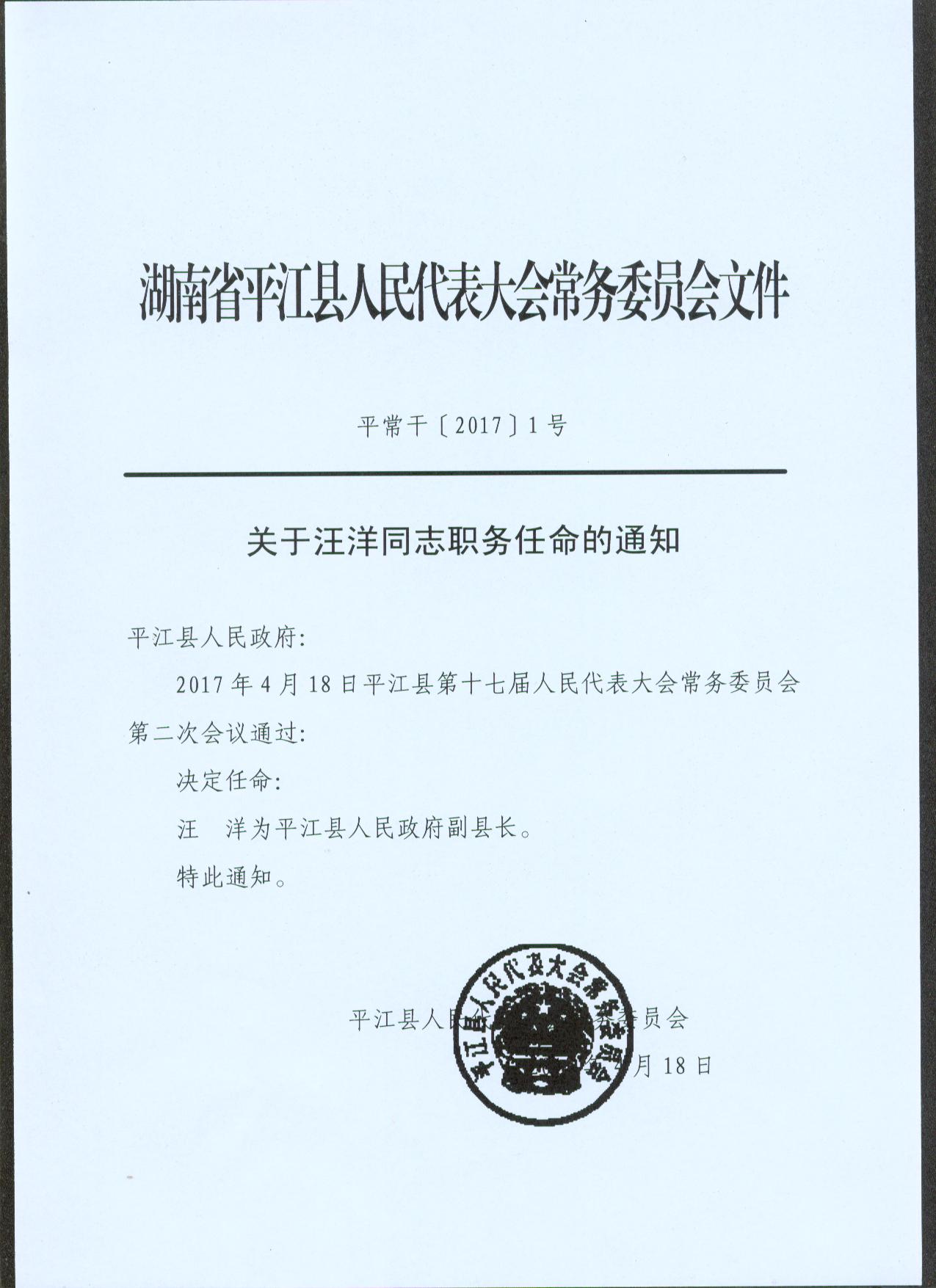 平常干〔2017〕1号关于汪洋同志职务任命的通知