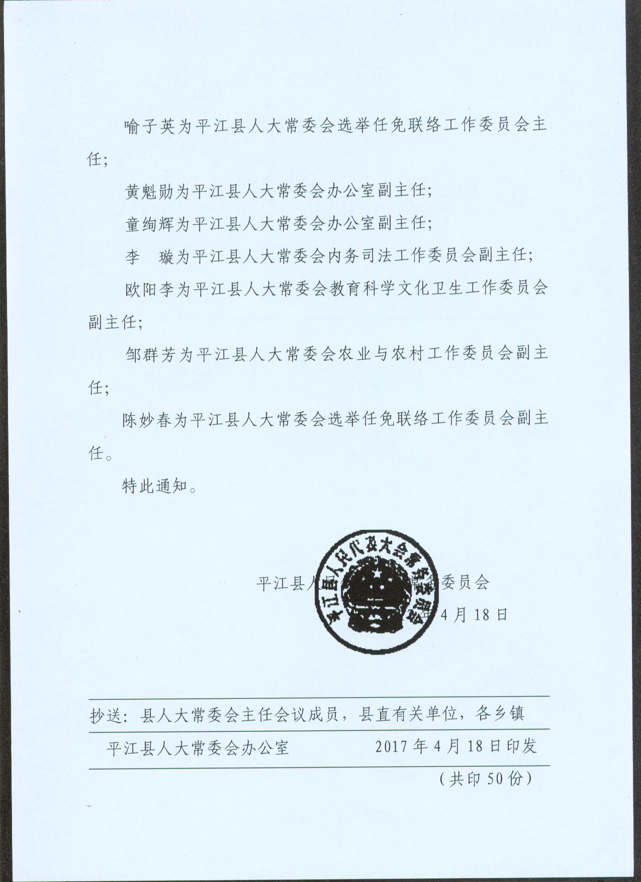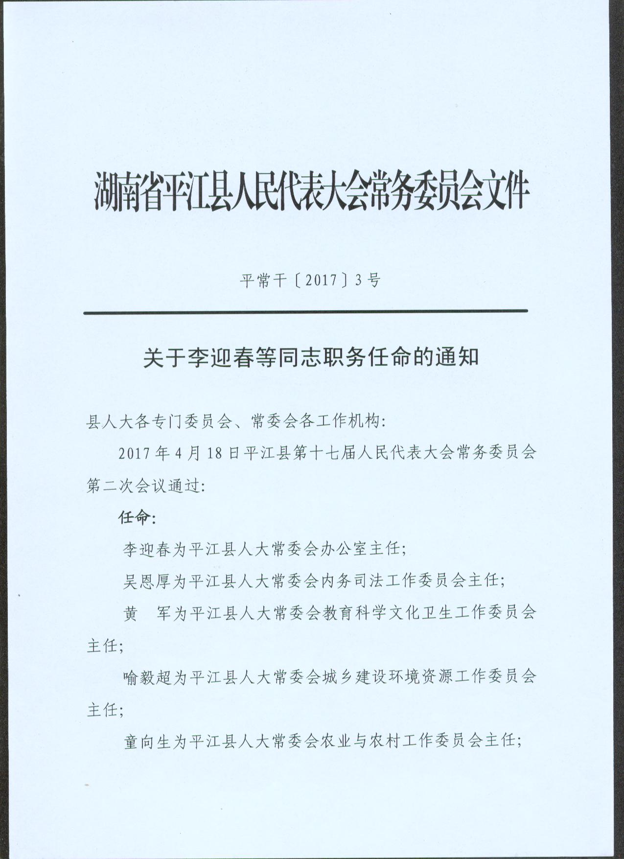 平常干〔2017〕3号关于李迎春等同志职务任命的通知