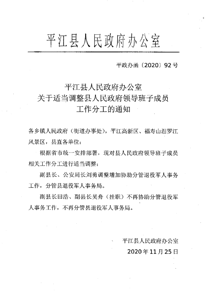 平江县人民政府办公室《关于适当调整县人民政府领导班子成员工作分工的通知》(平政办函〔2020〕92号)