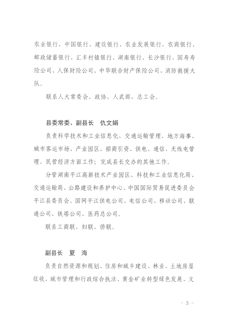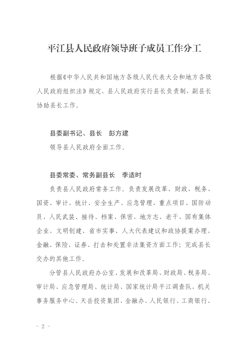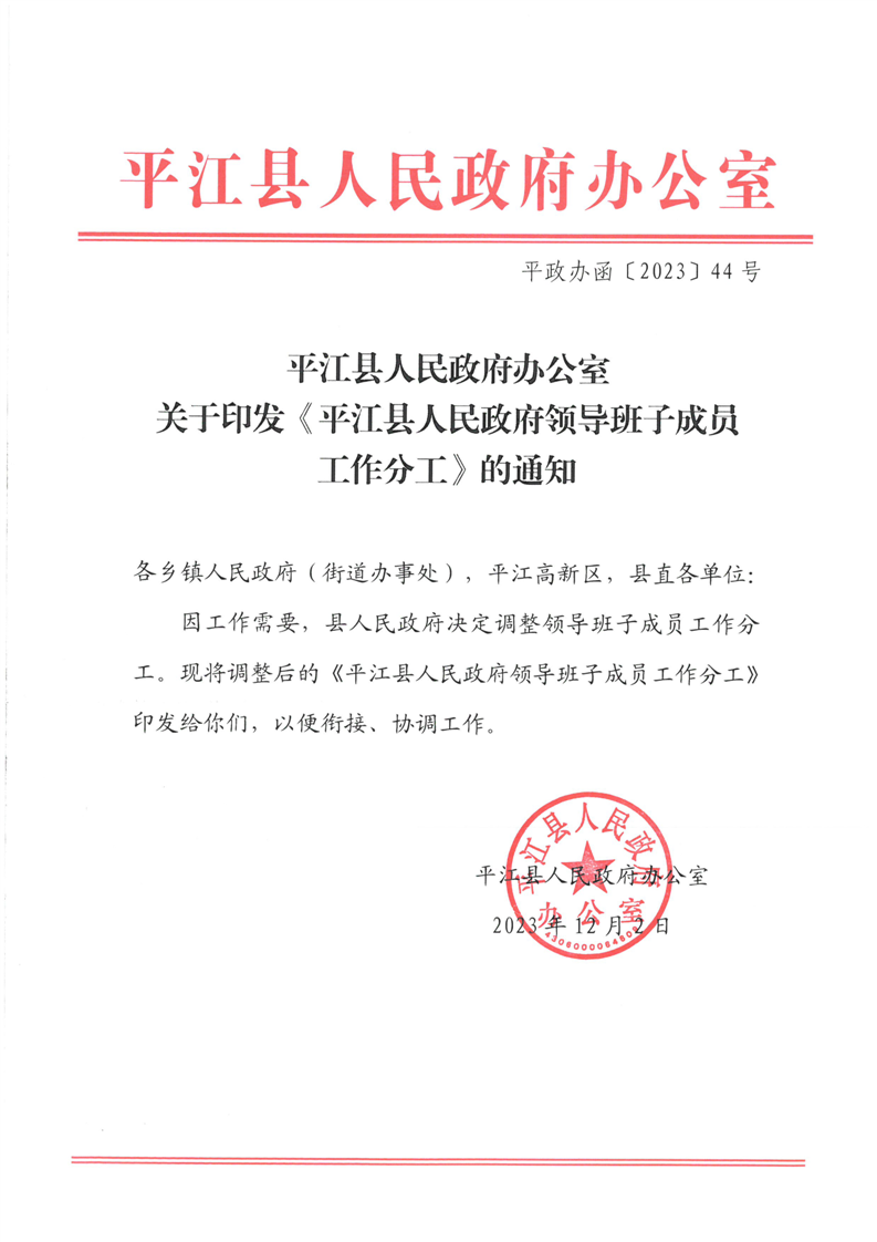 平政办函〔2023〕44号关于印发《平江县人民政府领导班子成员工作分工》的通知