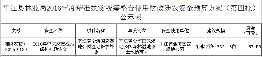 平江县林业局2016年度精准扶贫统筹整合使用财政涉农资金预算方案(第四批)公示表