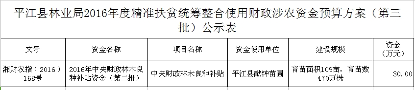 平江县林业局2016年度精准扶贫统筹整合使用财政涉农资金预算方案(第三批)公示表