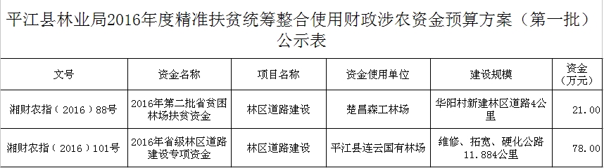 平江县林业局2016年度精准扶贫统筹整合使用财政涉农资金预算方案(第一批)公示表
