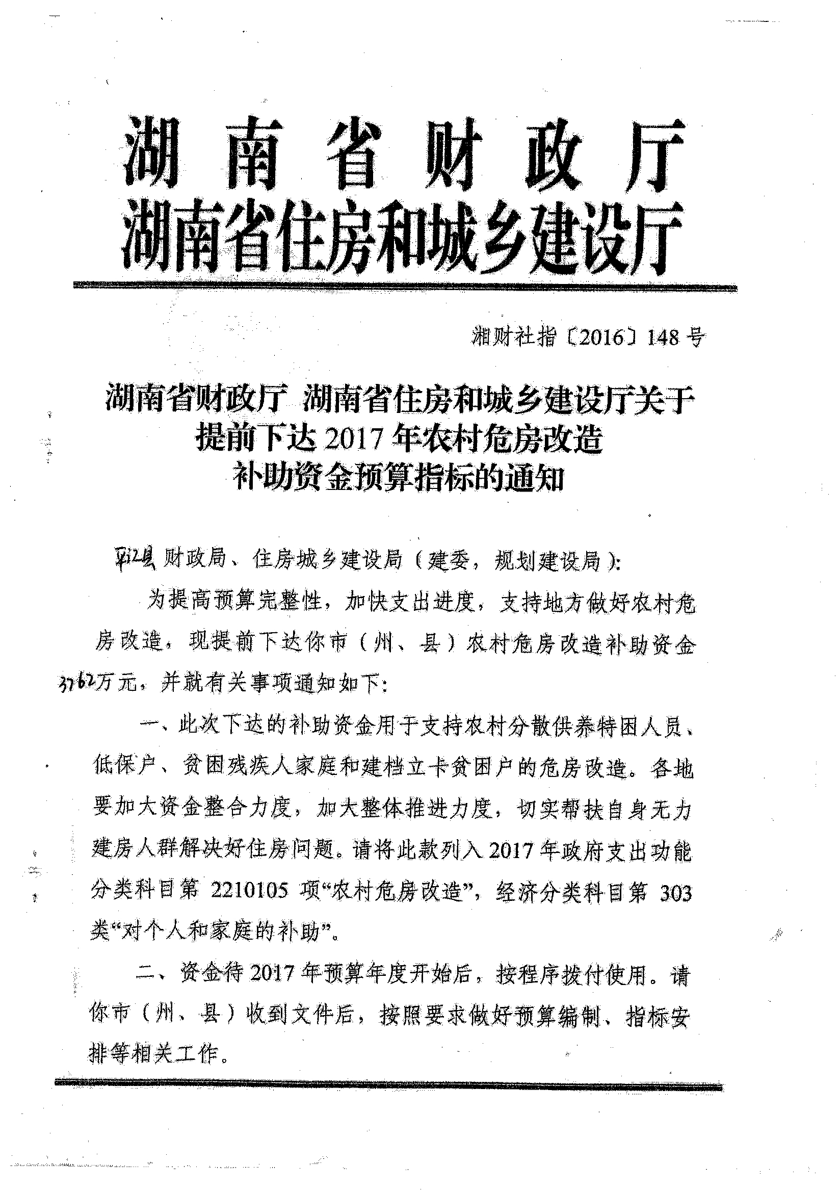 关于提前下达2017年农村危房改造补助资金预算指标的通知