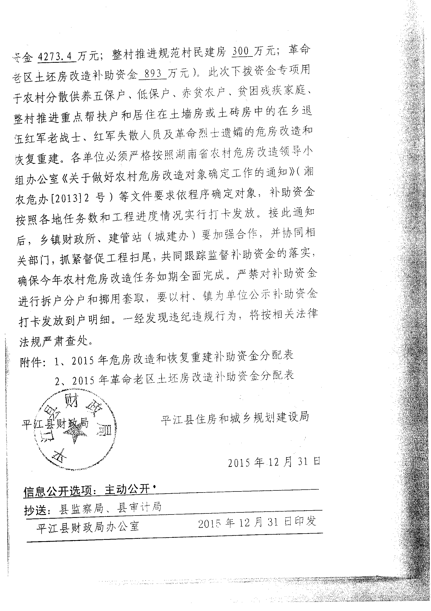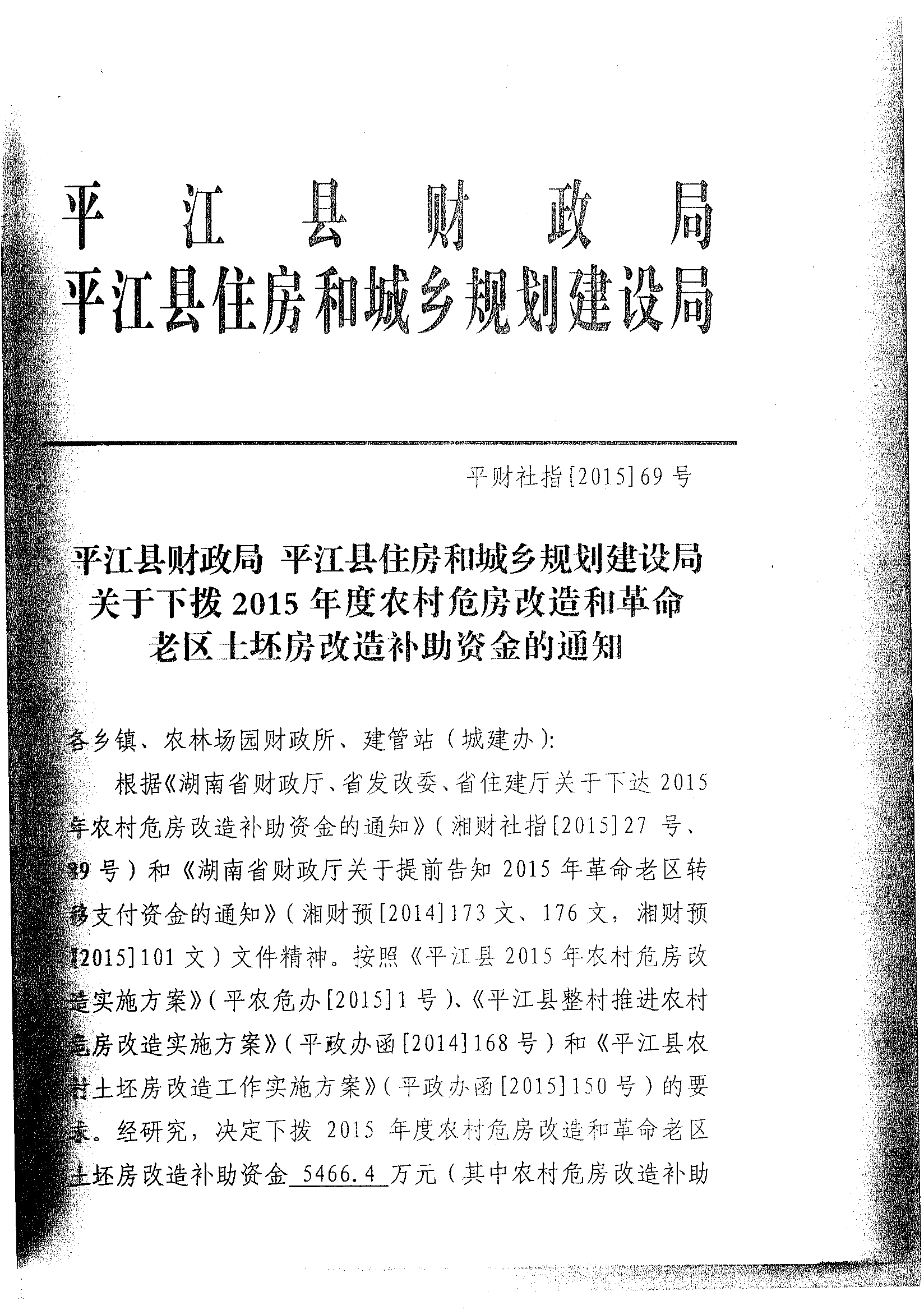平财社指〔2015〕69号关于下拨2015年度农村危房改造和革命老区土坯房改造补助资金的通知