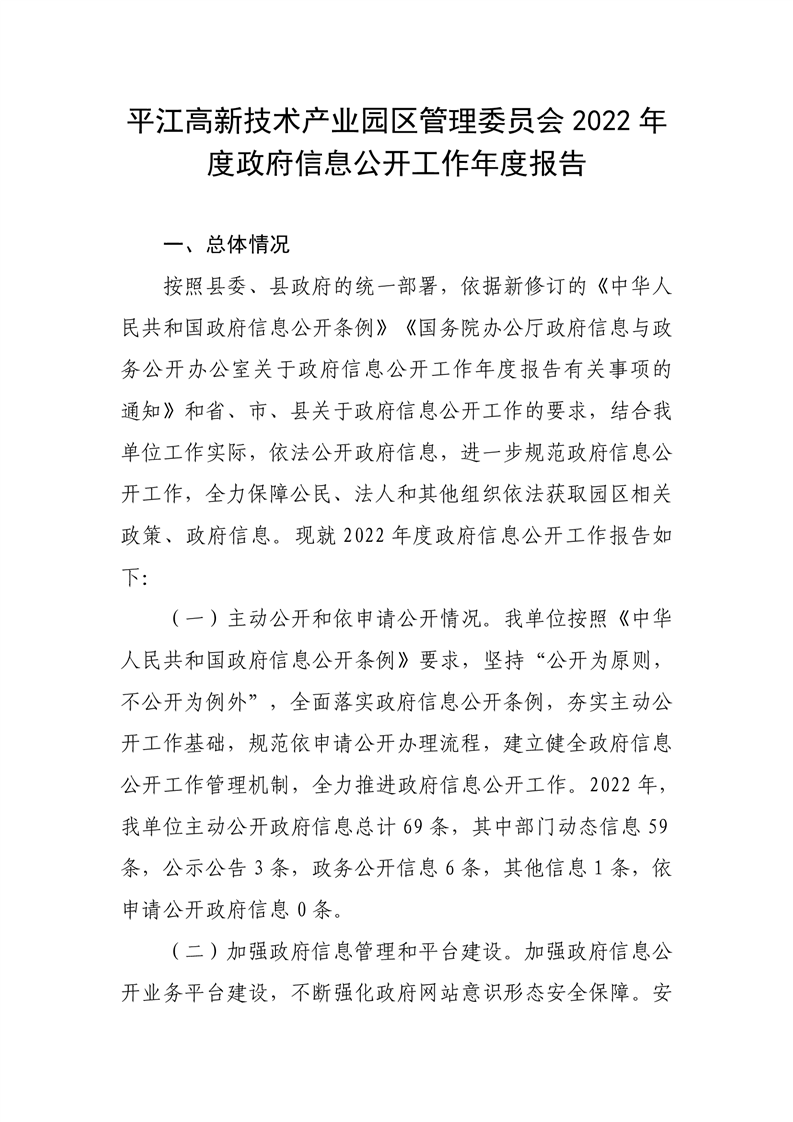 平江高新技术产业园区管理委员会2022年度政府信息公开工作年度报告