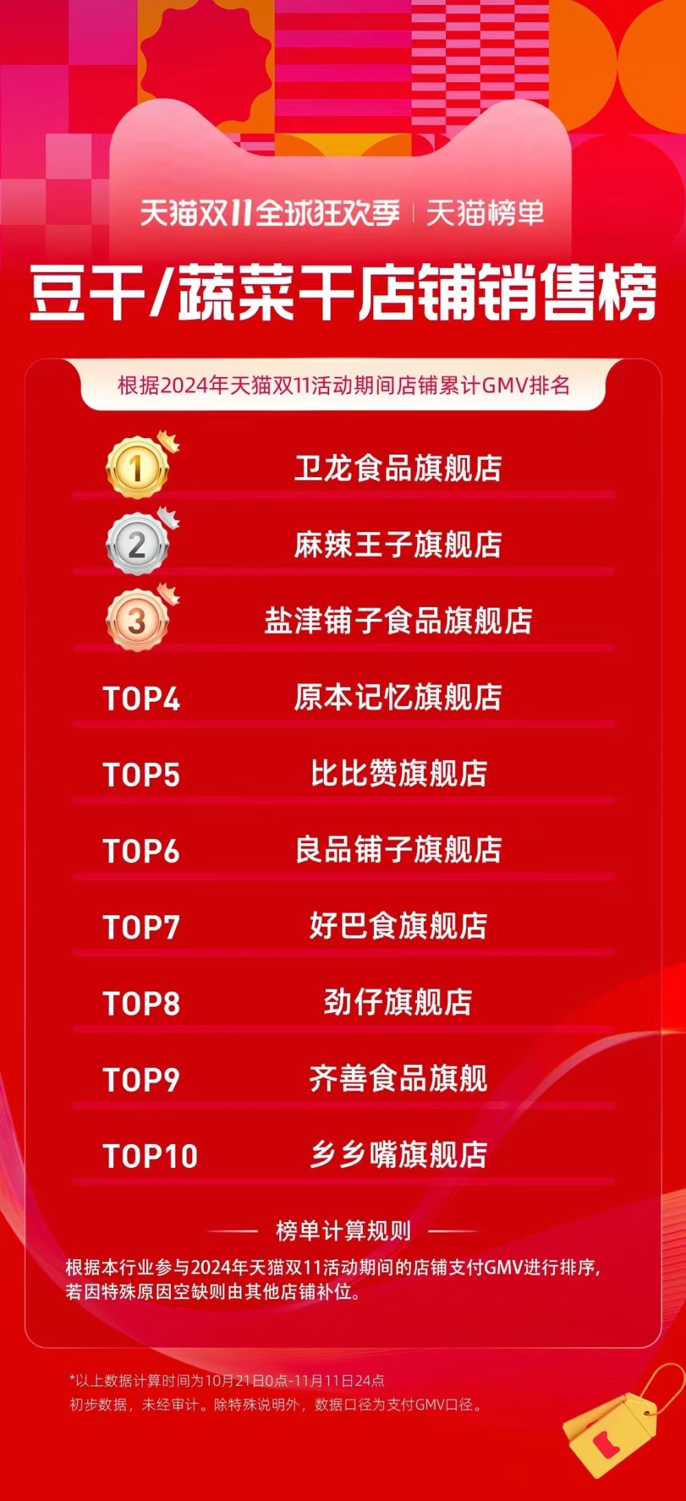 在刚刚揭晓的天猫双十一全球狂欢季天猫榜单中,平江的三家休闲食品企业——麻辣王子旗舰店、原本记忆旗舰店、劲仔旗舰店,在豆干/蔬菜干店铺销售榜上大放异彩,荣登前十宝座,分别排第二、第四、第八,展现了我县休闲食品产业的强劲实力和卓越品质。