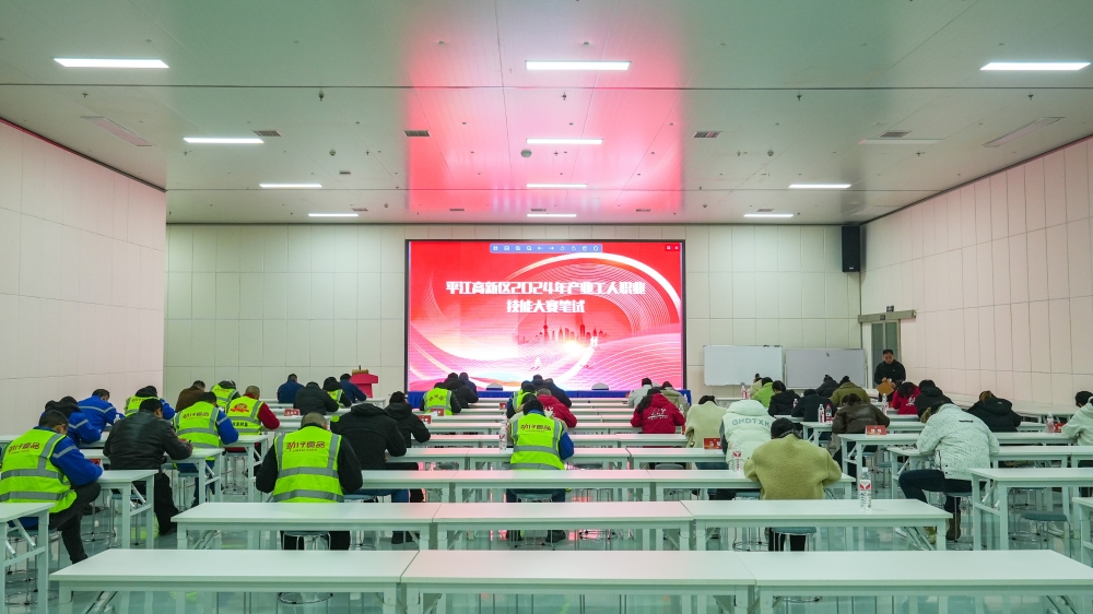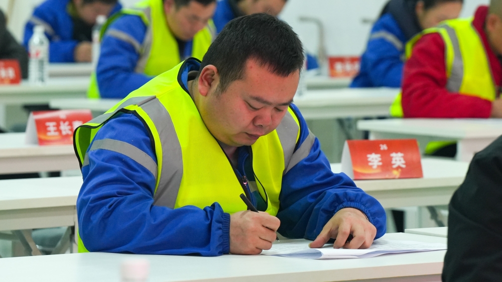 理论考场上,限时 60 分钟的闭卷测试,53名产业工人们全神贯注、奋笔疾书,100分试卷,将以30%计入总分。