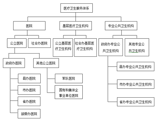 医疗卫生服务体系主要包括医院、基层医疗卫生机构和专业公共卫生机构等(见图示)。医院分为公立医院和社会办医院。其中,公立医院分为政府办医院(根据功能定位主要划分为县办医院、市办医院、省办医院、部委办医院)和其他公立医院(主要包括军队医院、国有和集体企事业单位等举办的医院)。县级以下为基层医疗卫生机构,分为公立和社会办两类。专业公共卫生机构分为政府办专业公共卫生机构和其他专业公共卫生机构(主要包括国有和集体企事业单位等举办的专业公共卫生机构)。根据属地层级的不同,政府办专业公共卫生机构划分为县办、市办和省办三类。