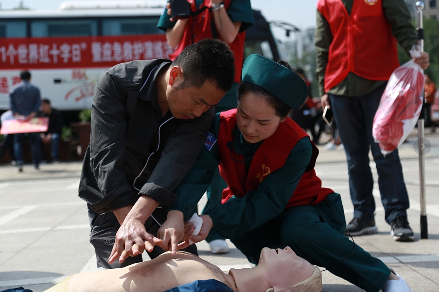 5月8日,红十字会志愿者现场教群众对“伤病员”进行心肺复苏按压。
