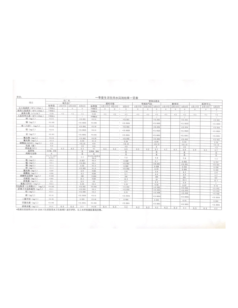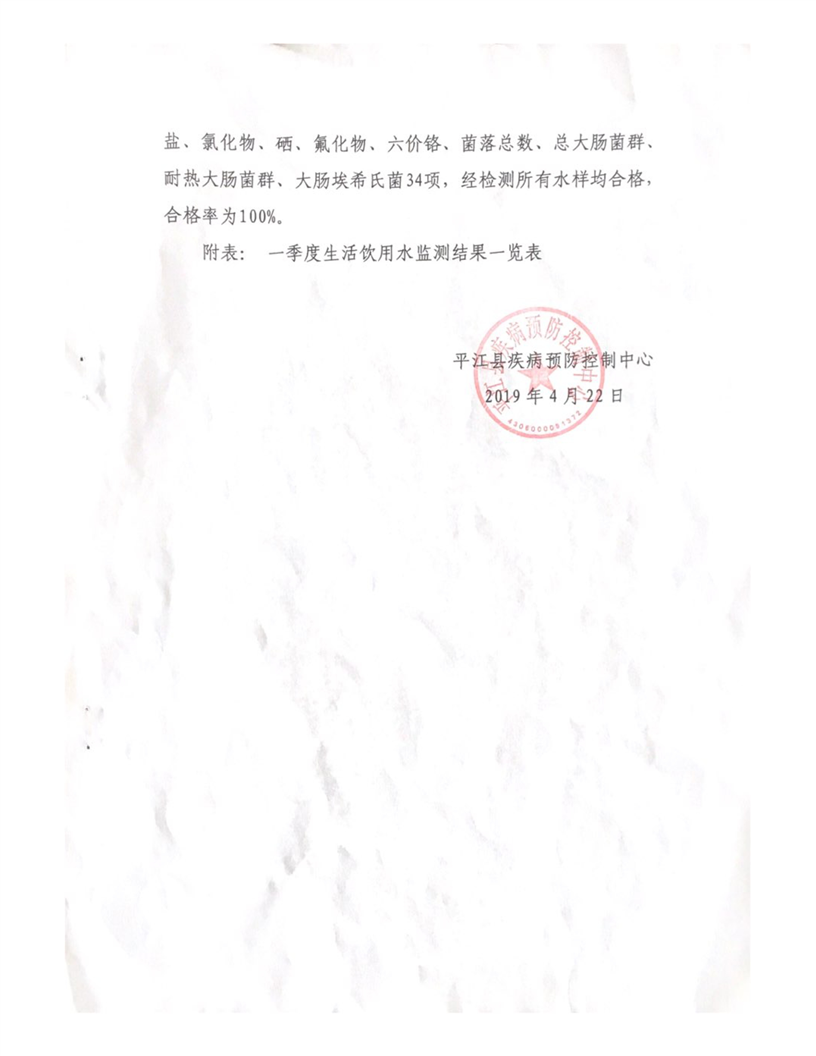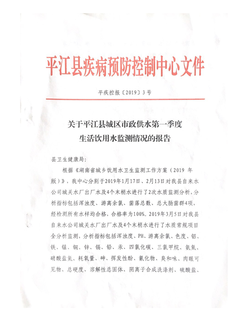 关于平江县城区市政供水第一季度生活饮用水监测情况的报告