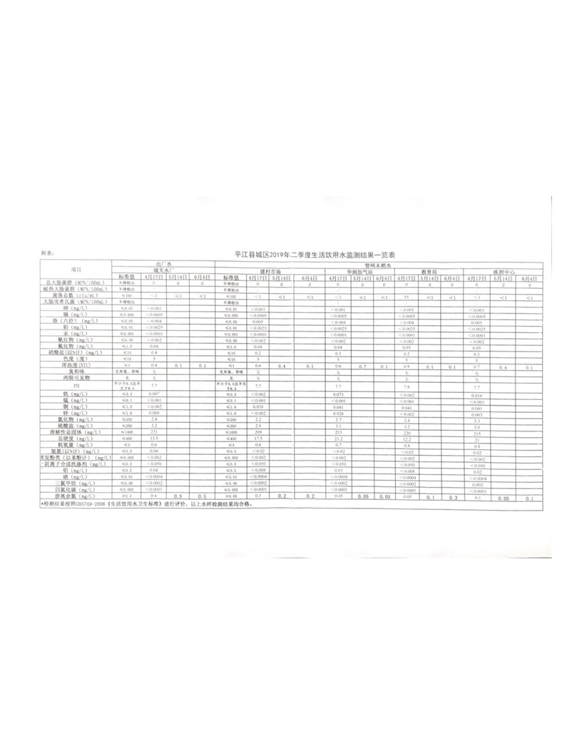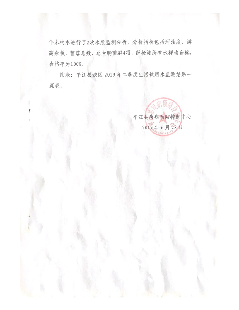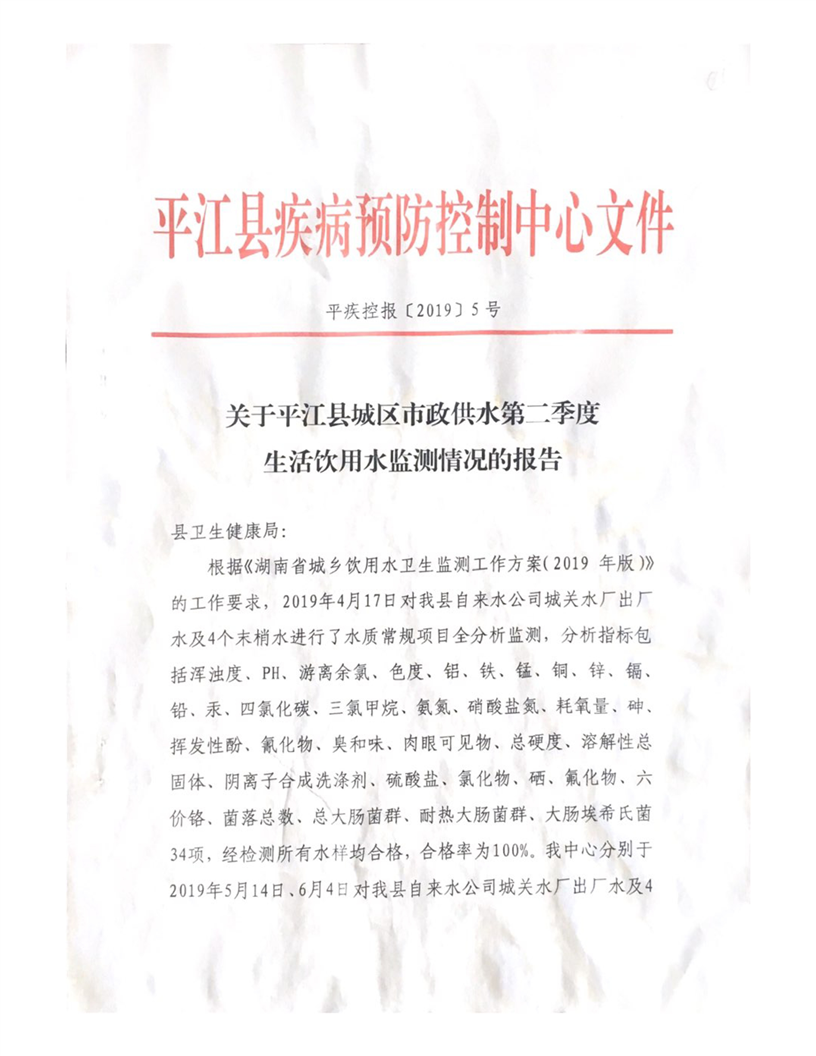 关于平江县城区市政供水第二季度生活饮用水监测情况的报告