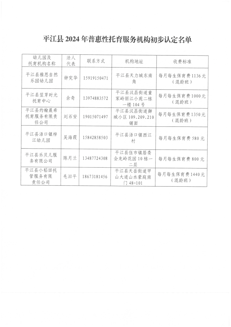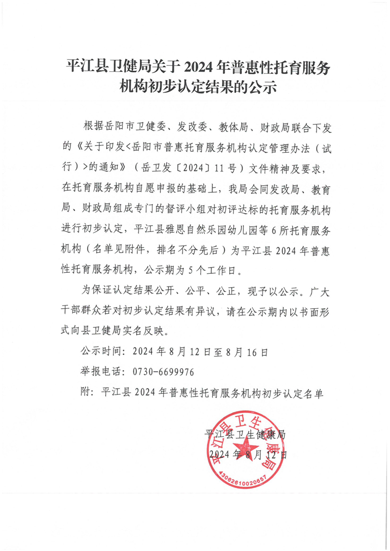 平江县卫健局关于2024年普惠性托育服务机构初步认定结果的公示