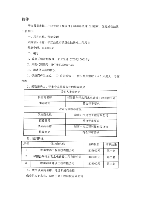 平江县童市镇卫生院景观工程项目竞争性谈判成交结果公告