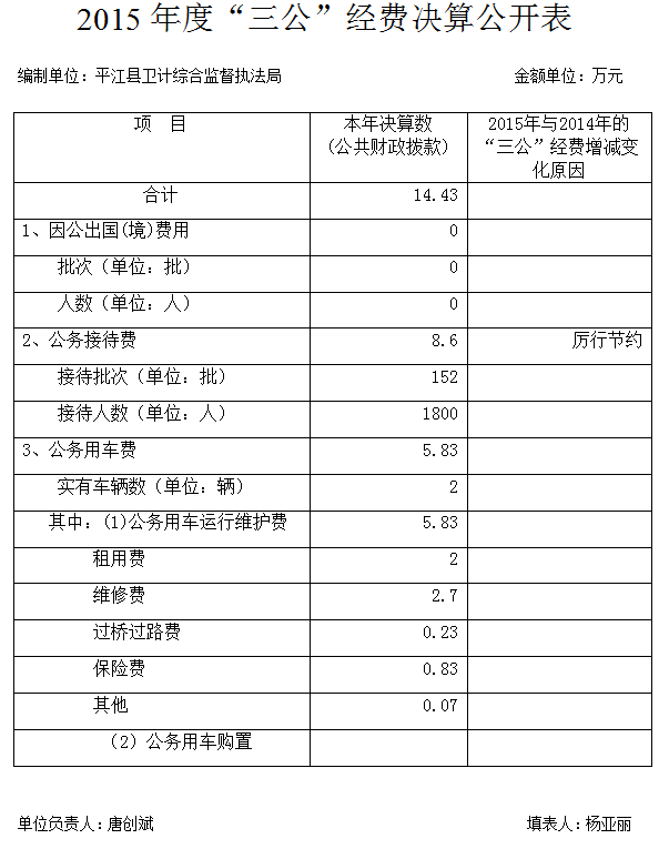 平江县卫计综合监督执法局2015年三公经费决算公开表
