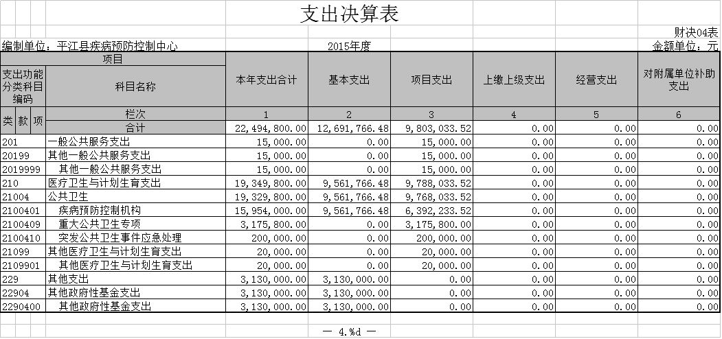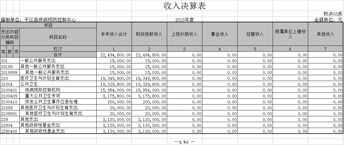 全年共实现总收入2249.48万元,其中非税收入收入1263万元,发生总支出2249.48万元, 达到收支平衡的预期目标;专用基金仍按上级要求,采用先提后用的,在预算外收支结余中提取,但2015年未计提;全年基建支出净增1321万元;专项业务工作全部达到和部分超过国家指标要求的预期目标。