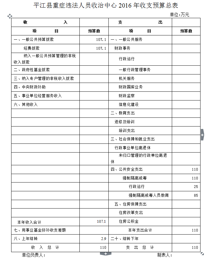 预算总收入110万元,其中:经费拨款107.1万元,上年结转2.9万元。