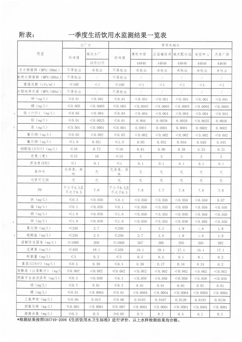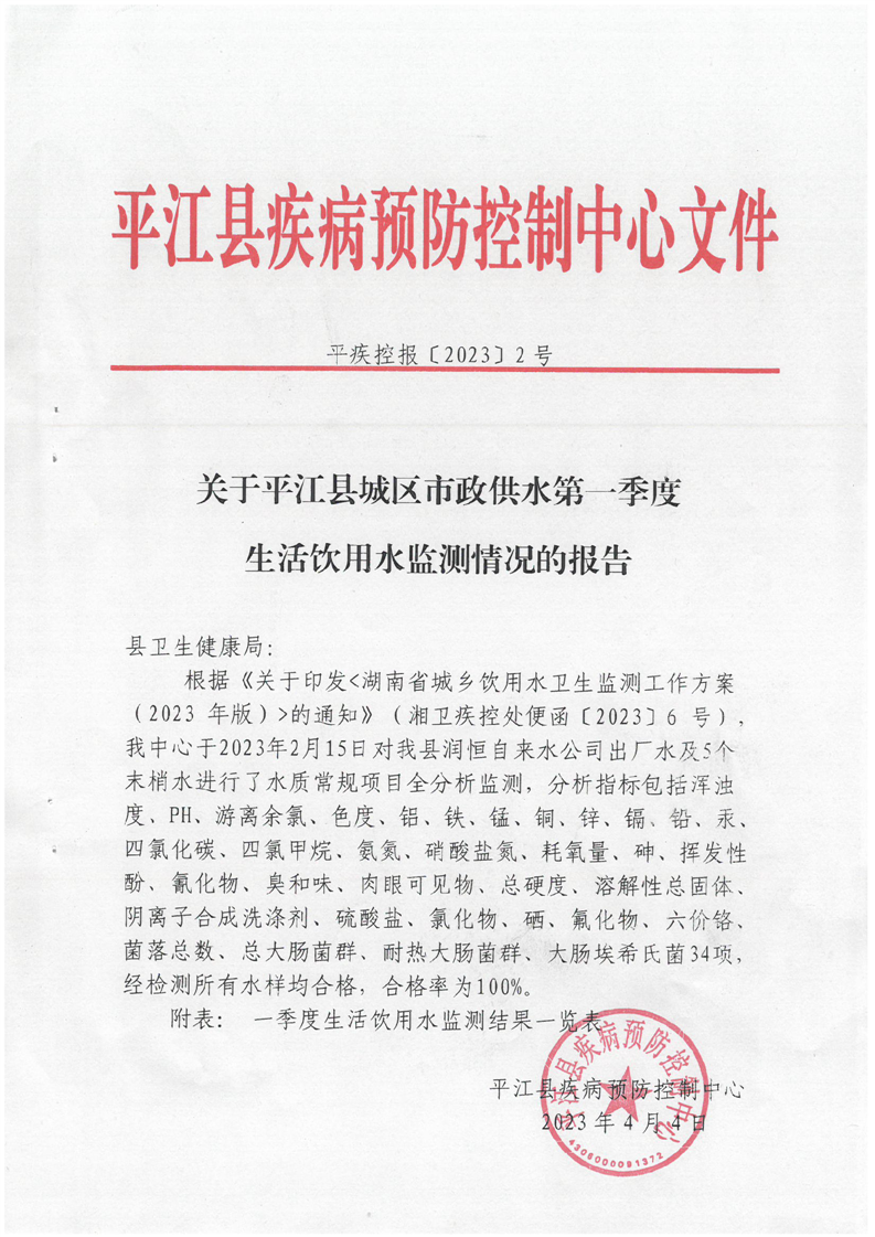2023年关于平江县城区市政供水第一季度生活饮用水监测情况的报告