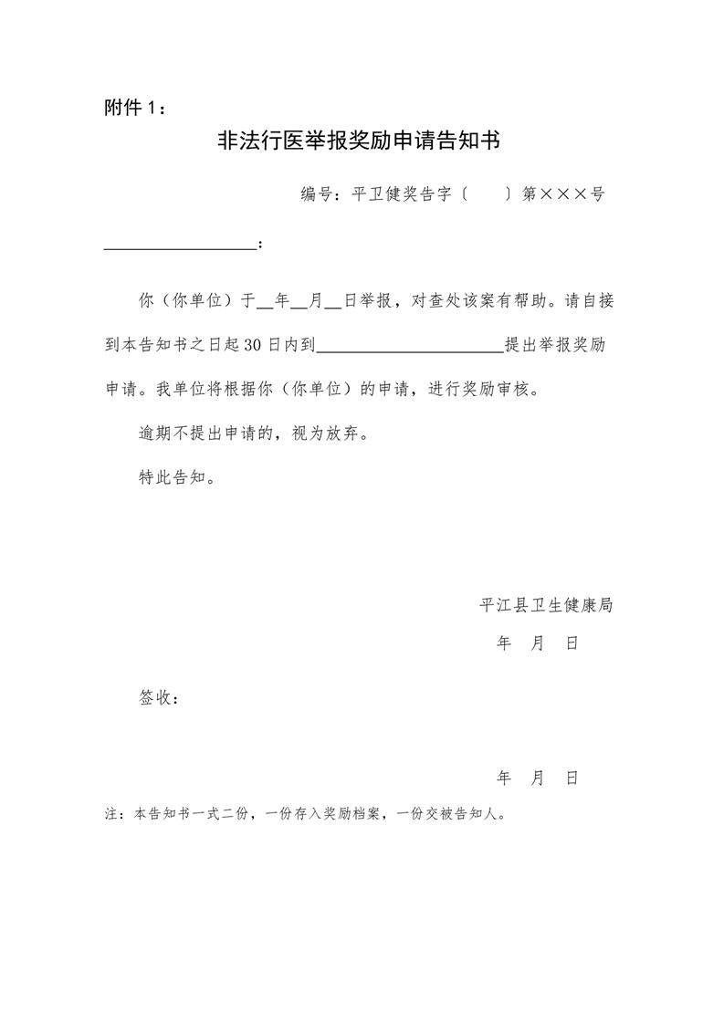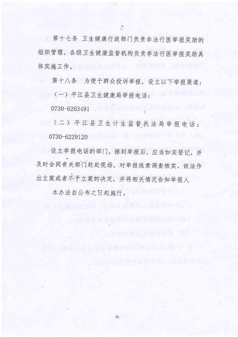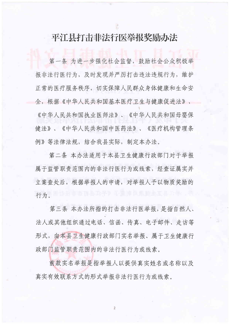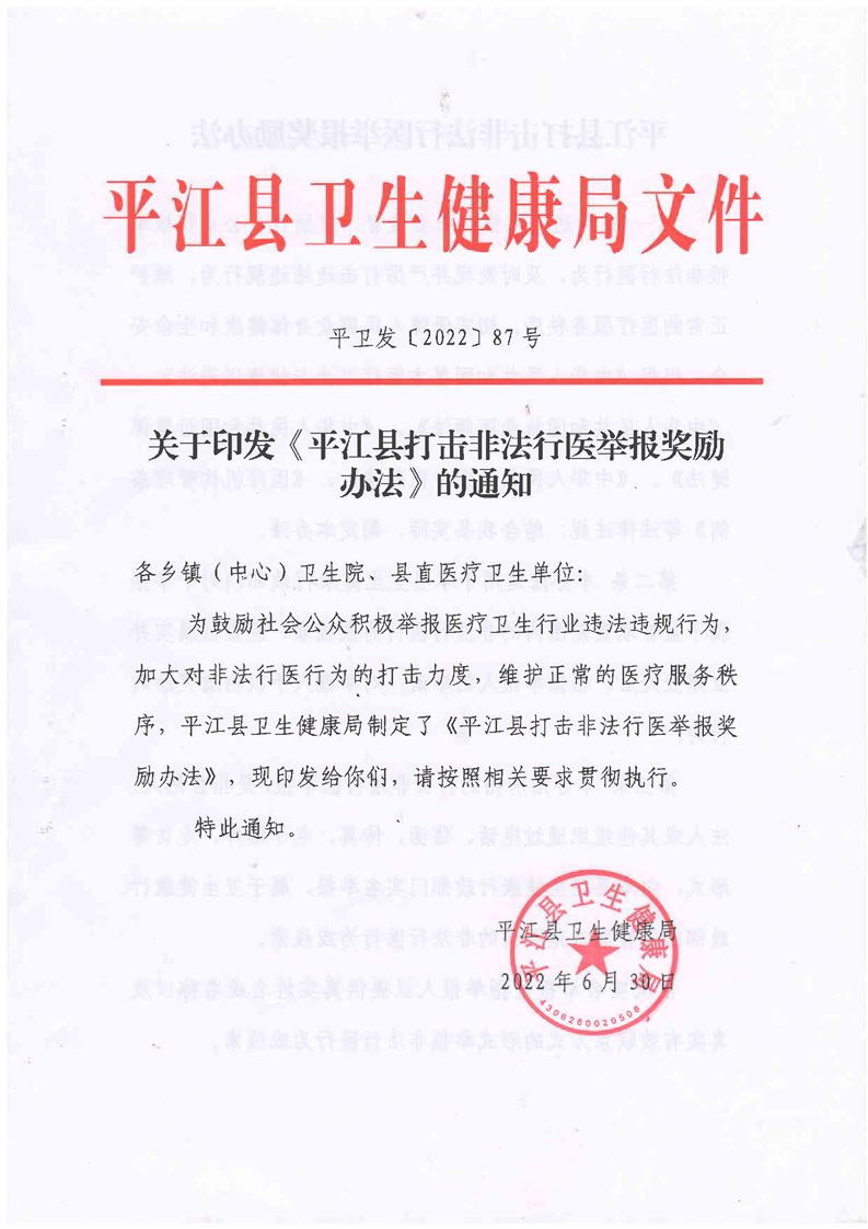 关于印发《平江县打击非法行医举报奖励办法》的通知