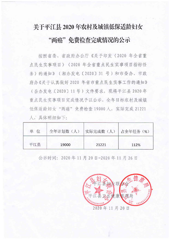 2020年农村及城镇低保适龄妇女“两癌”免费检查完成情况的公示