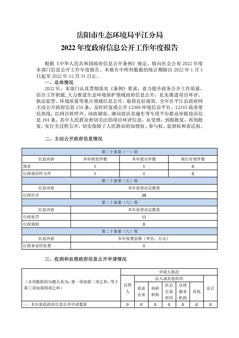 岳阳市生态环境局平江分局2022年度政府信息公开工作年度报告