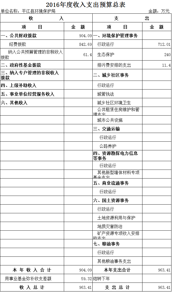 2016年预算总收入963.41万元。其中,公共财政拨款904.09万元(经费拨款842.69万元,纳入公共预算管理的非税收入拨款61.4万元);上年结转59.32万元。预算总支出963.41万元。预算收支平衡。