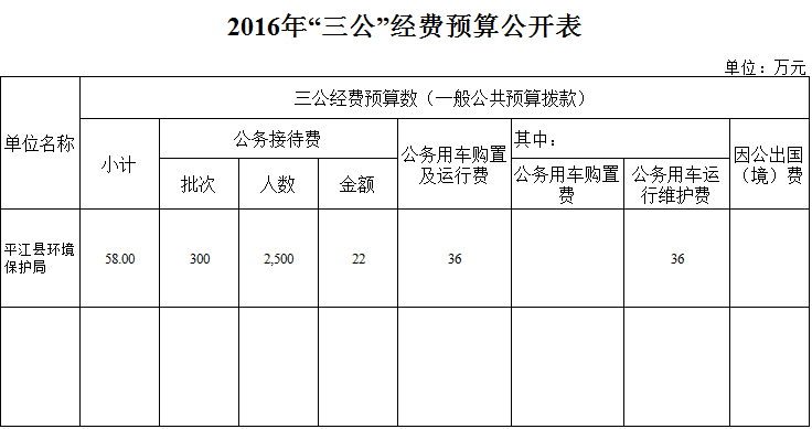 我局2016年部门预算“三公”经费合计58万元。其中:公务接待费22万元;公务用车运行维护费36万元;与2015年部门预算“三公”经费相比,因新增农村环境综合整治整县推进项目,预计增加三公经费6万元,剔除该增加原因整体实际下降了5.98%。