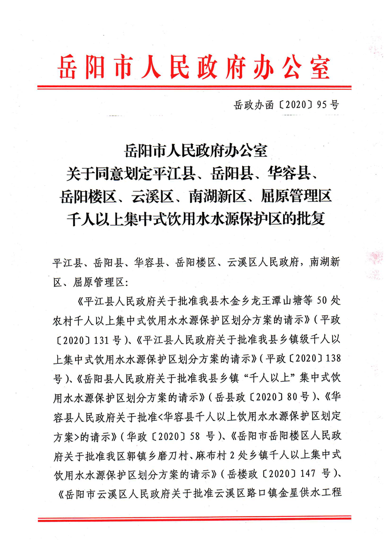 岳阳市人民政府办公室关于同意划定平江县、岳阳县、华容县、 岳阳楼区、云溪区、南湖新区、屈原管理区千人以上集中式饮用水水源保护区的批复.doc