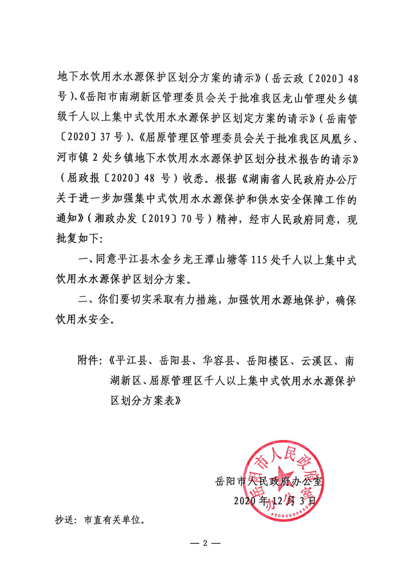 岳阳市人民政府办公室关于同意划定平江县、岳阳县、华容县、 岳阳楼区、云溪区、南湖新区、屈原管理区千人以上集中式饮用水水源保护区的批复