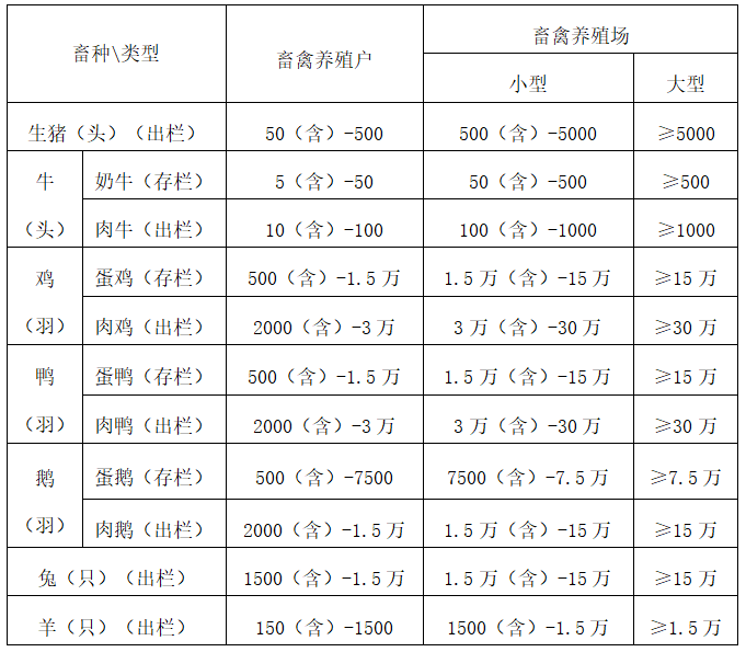 第三条 单一畜种畜禽养殖规模的划分标准如下: