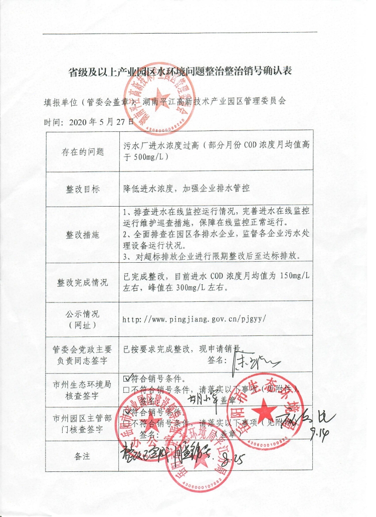 湖南平江高新技术产业园区水环境问题整治销号公示