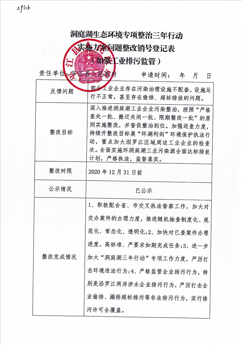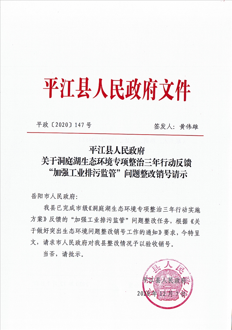平江县人民政府关于洞庭湖生态环境专项整治三年行动反馈“加强工业排污监管”问题整改销号请示