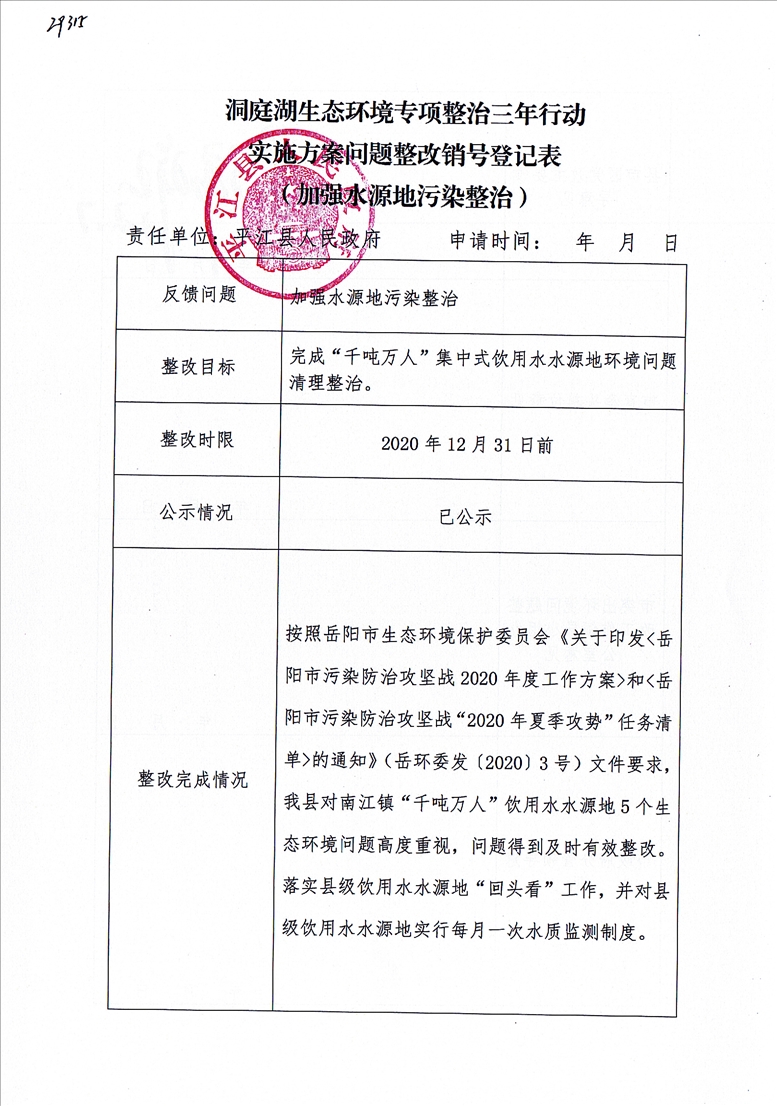 平江县人民政府关于洞庭湖生态环境专项整治三年行动反馈“加强水源地污染整治”问题整改销号请示