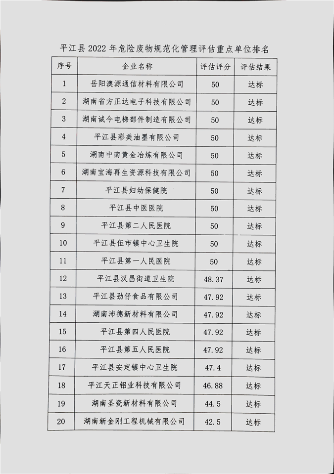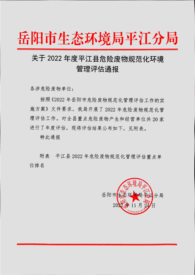 关于2022年度平江县危险废物规范化环境管理评估通报