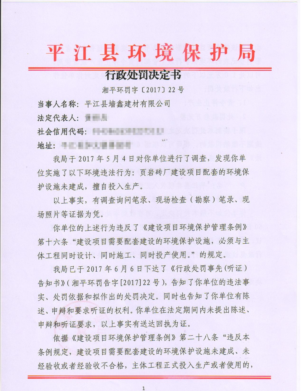 墙鑫建材处罚决定书