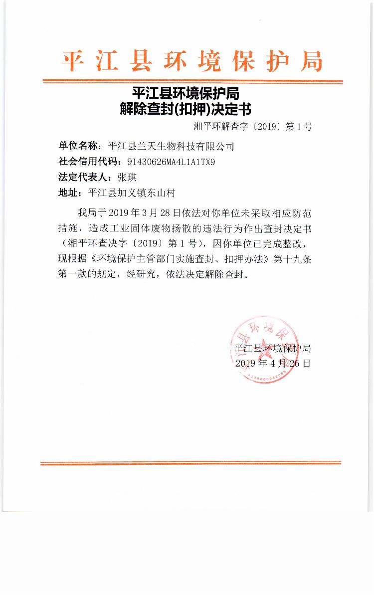 平江县兰天生物科技有限公司解封决定书