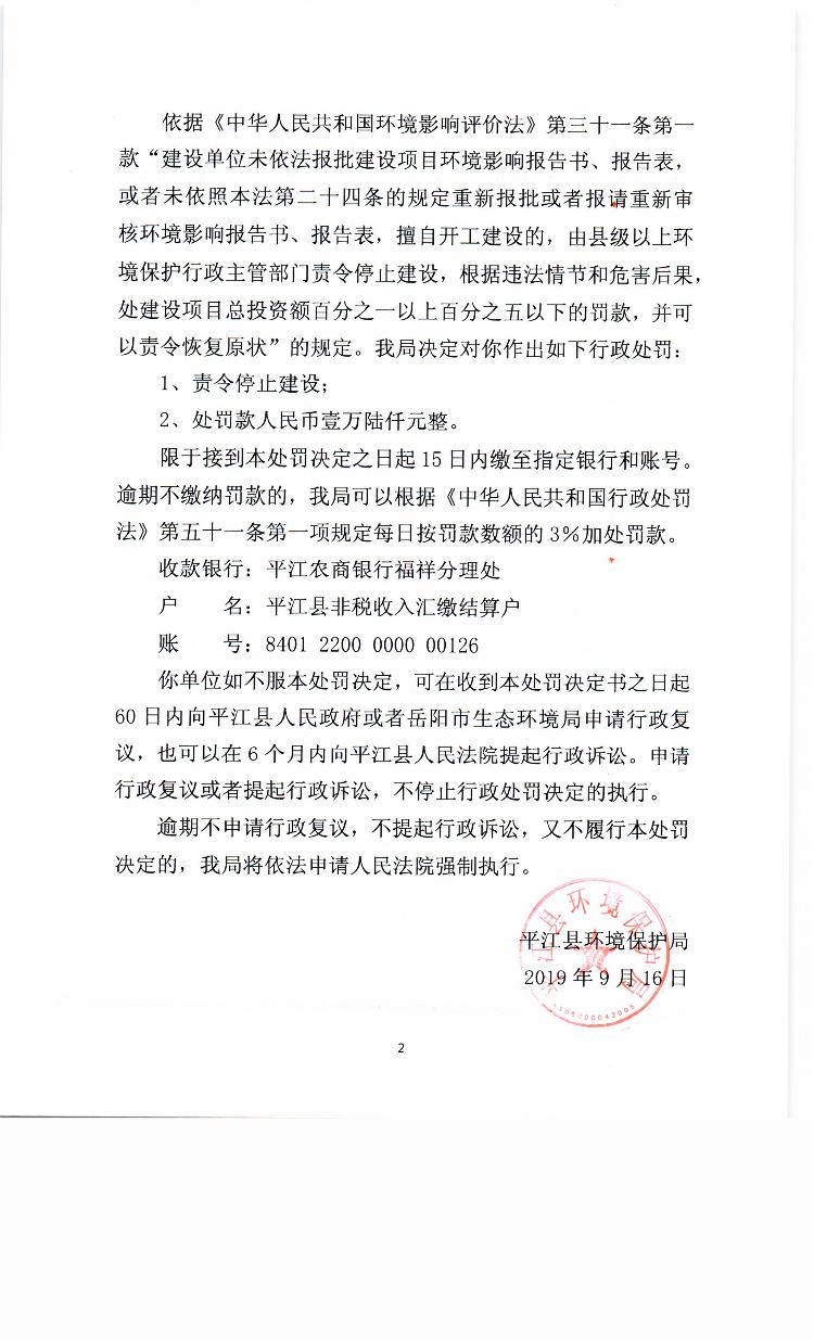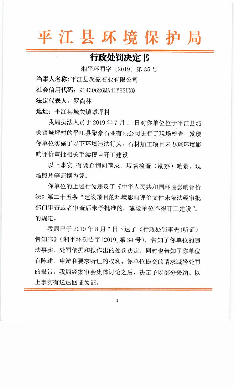平江县聚豪石业有限公司行政处罚决定书