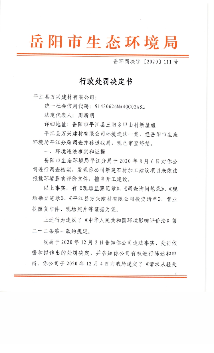 平江县万兴建材有限公司111号处罚决定书