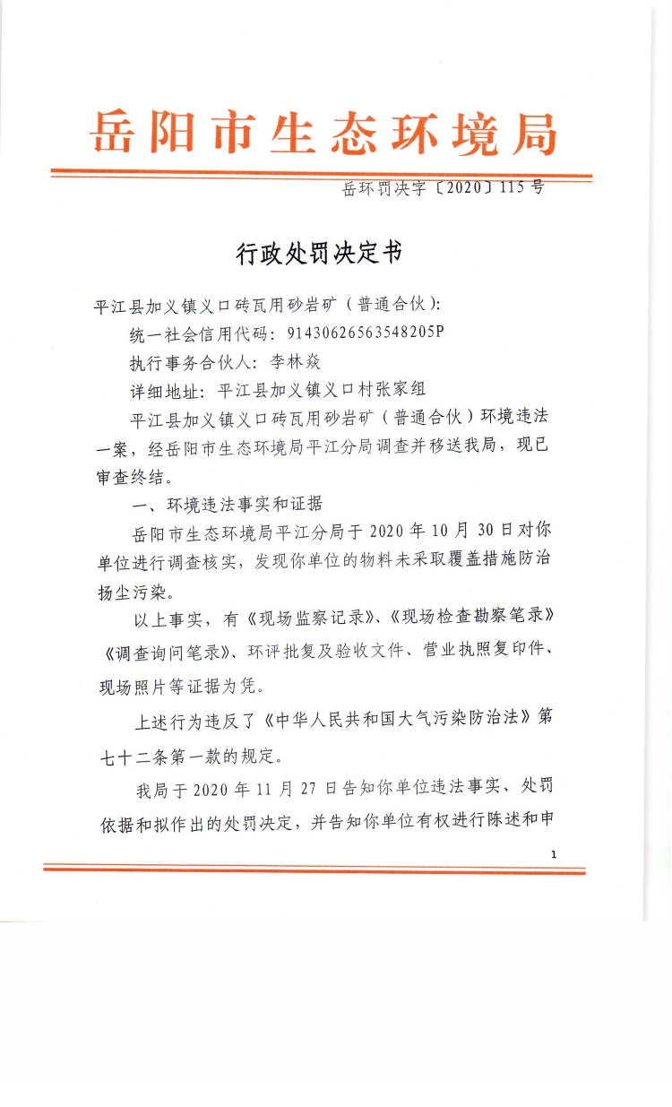 平江县加义镇义口砖瓦用砂岩矿115号处罚决定书