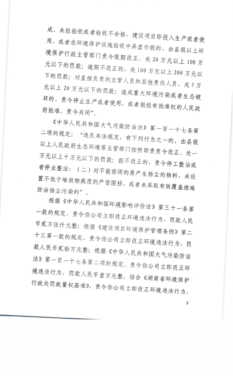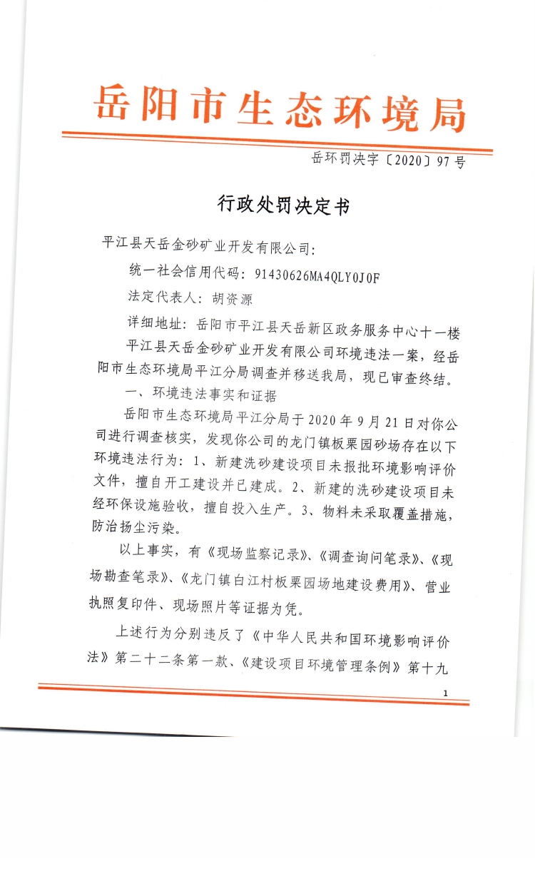 平江县天岳金砂矿业开发有限公司(板栗园)97号处罚决定书